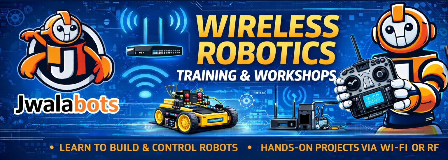 Jwalabots offers hands-on wireless robotics training and workshops designed to teach students modern control technologies using Bluetooth, Wi-Fi, and RF systems. Our programs focus on practical learning, innovation, and real-time robot control experience.